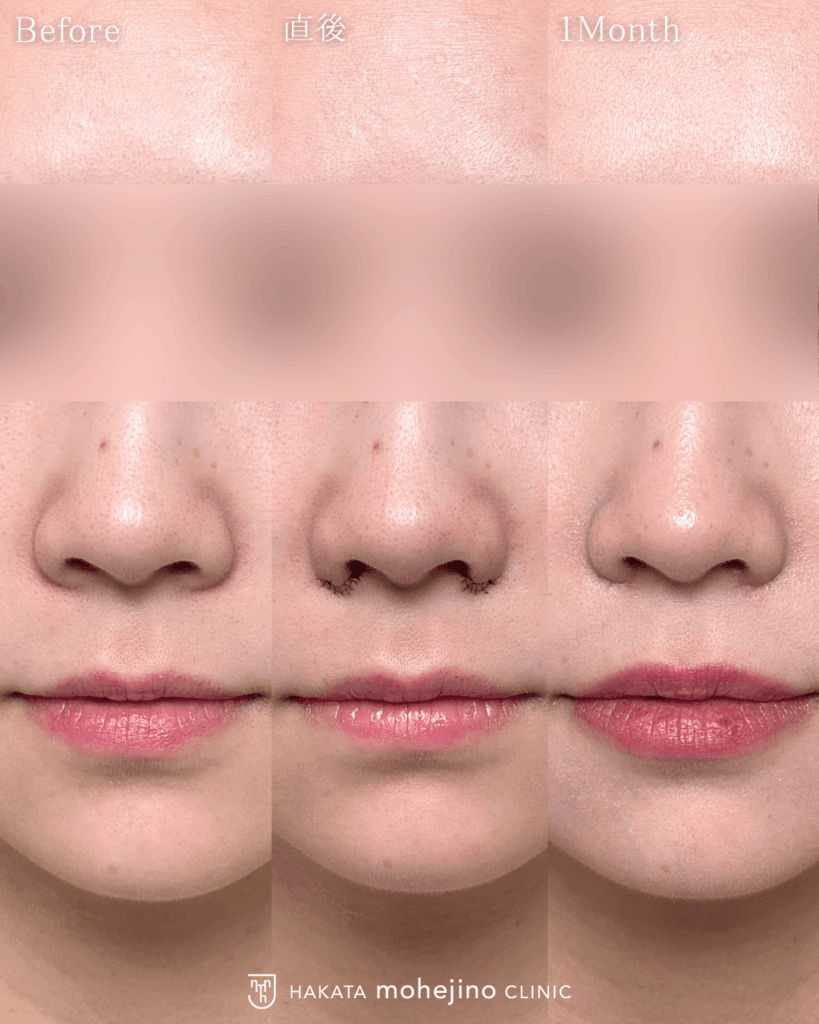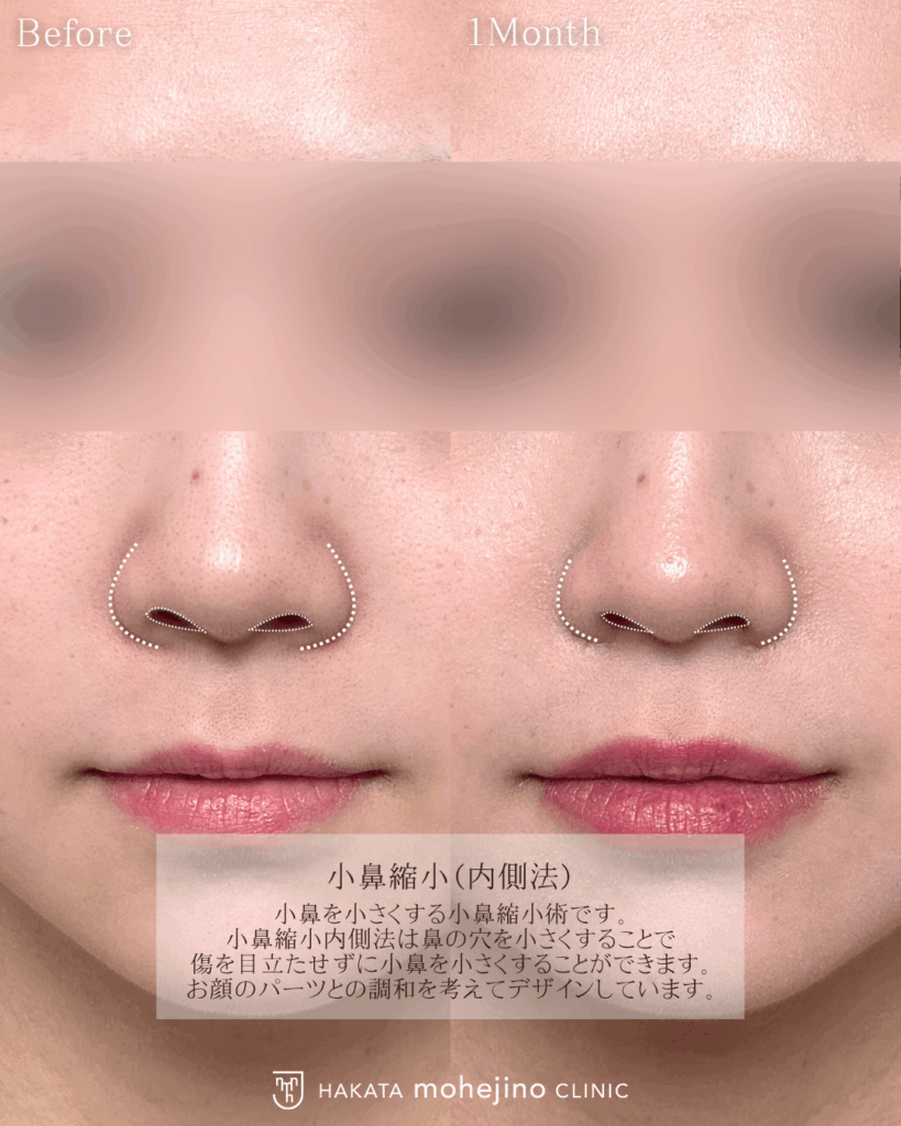 施術の説明 | 小鼻を小さくする小鼻縮小術の症例です。 小鼻縮小内側法は鼻の穴を小さくすることで傷を目立たせずに小鼻を小さくすることができます。 お顔のパーツとの調和を考えてデザインしています。 |