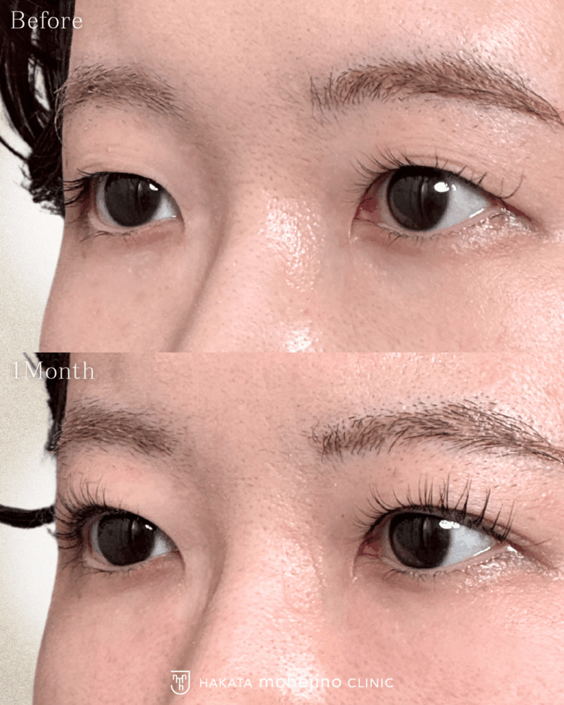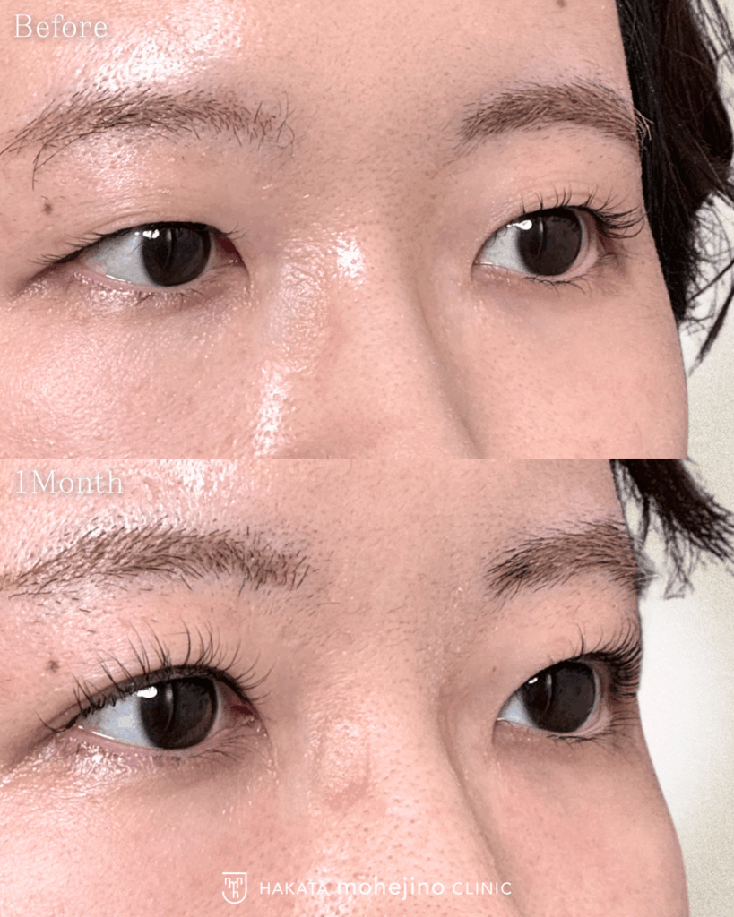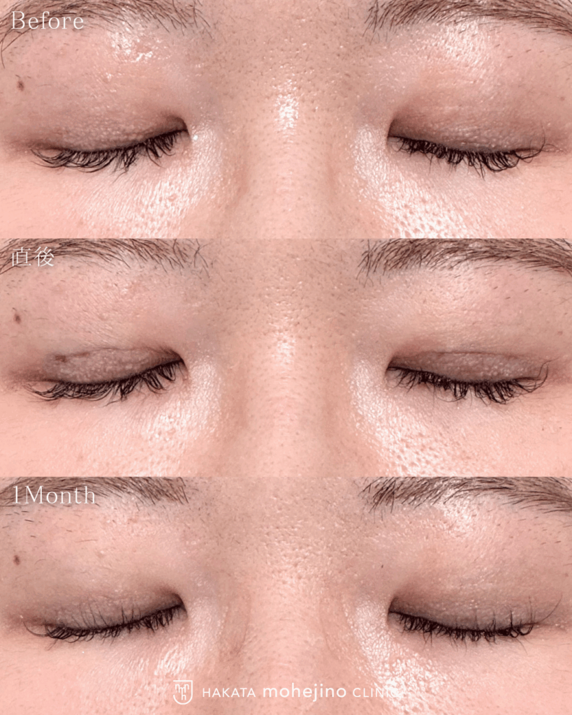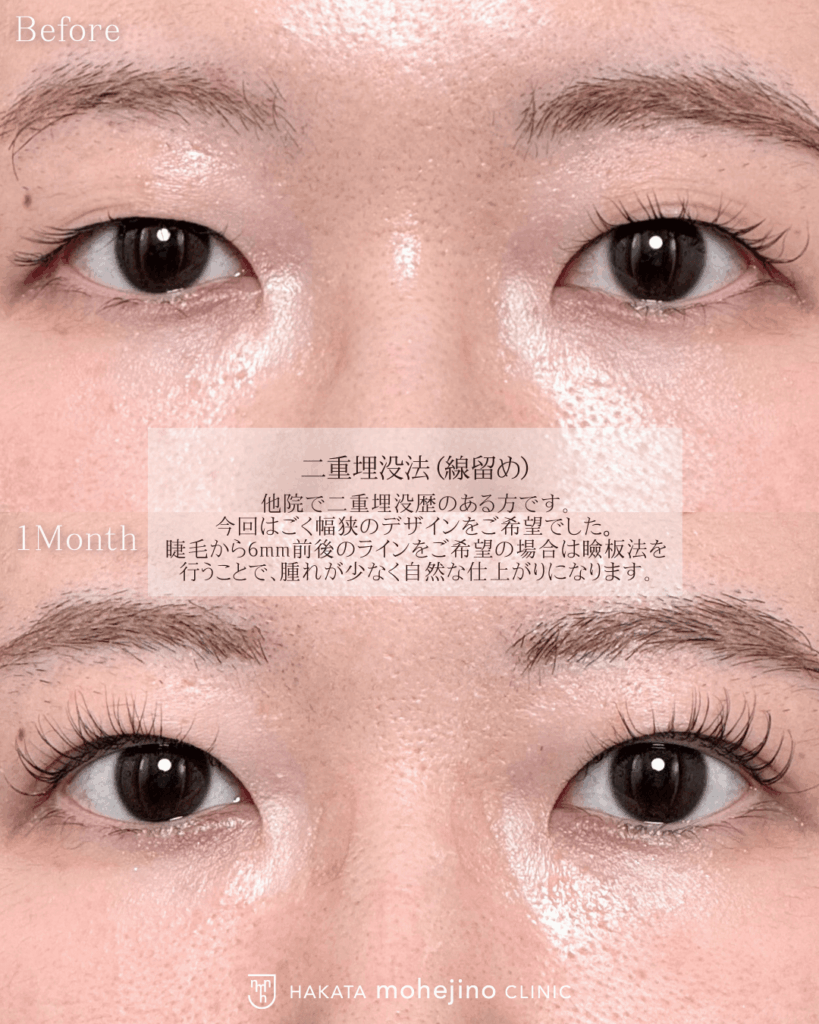 施術の説明 | 二重埋没法線留めの症例です。 他院で二重埋没歴のある方で、今回はごく幅狭のデザインをご希望でした。 睫毛から6mm前後のラインをご希望の場合は瞼板法を行うことで、腫れが少なく自然な仕上がりになります。 |