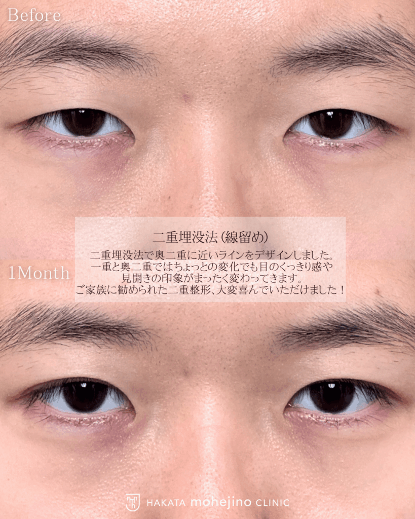 | 施術の説明 | 二重埋没法で奥二重に近いラインをデザインしました。 一重と奥二重ではちょっとの変化でも目のくっきり感や 見開きの印象がまったく変わってきます。 ご家族に勧められた二重整形、大変喜んでいただけました! |