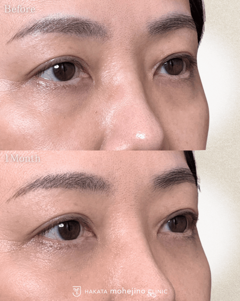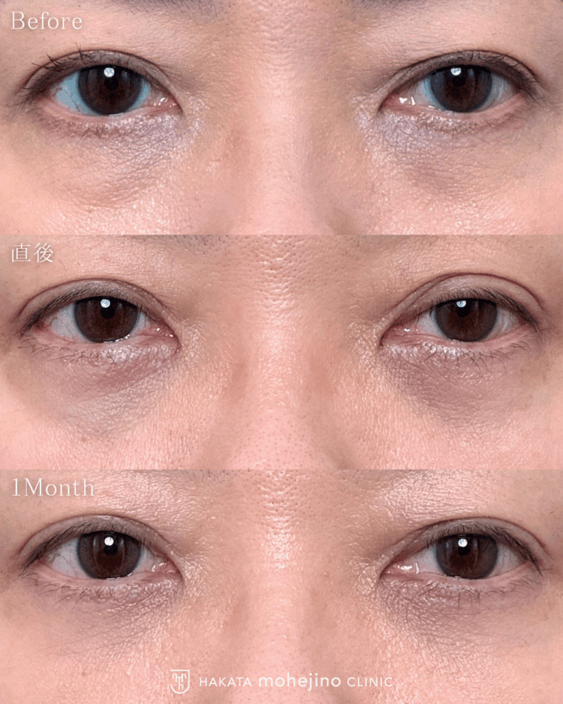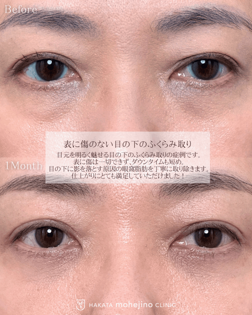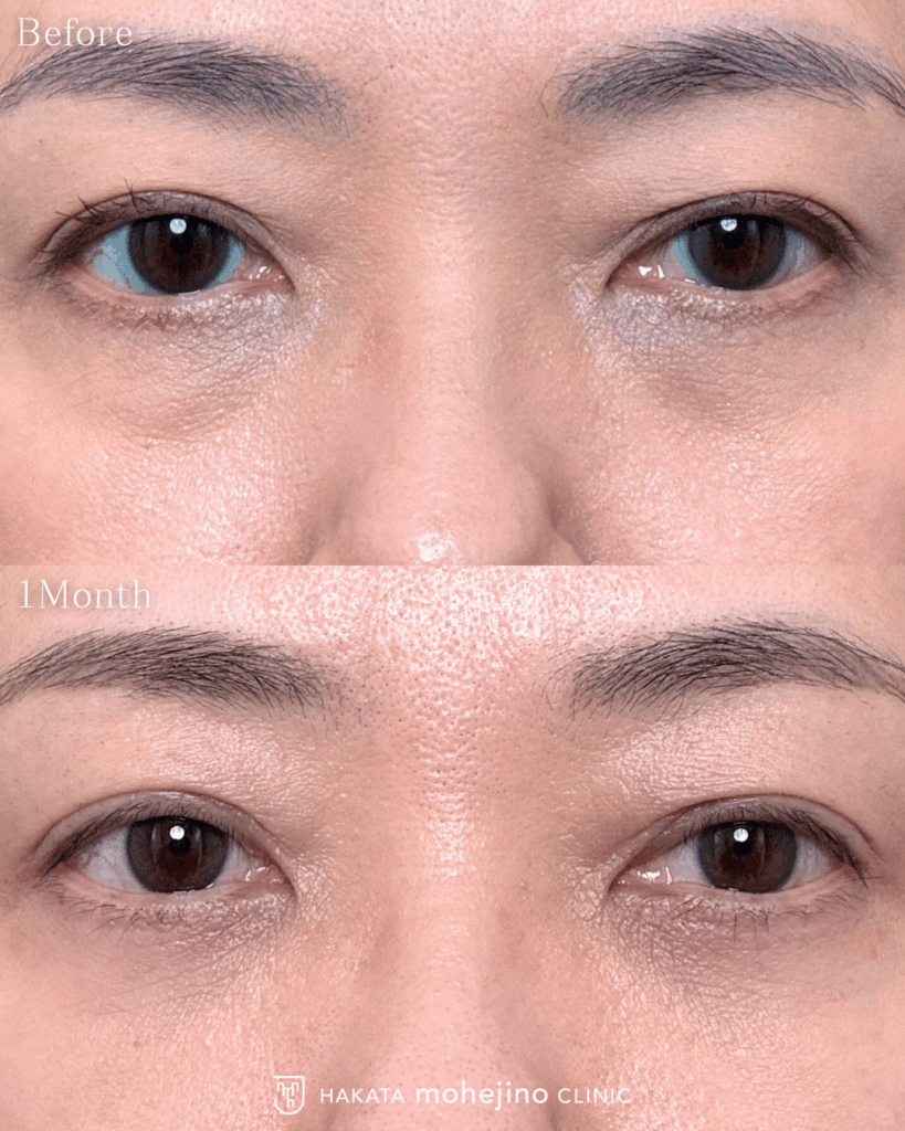 | 施術の説明 | 目元を明るく魅せるクマ治療、目の下のふくらみ取りの症例です。 表に傷は一切できず、ダウンタイムも短め。 目の下に影を落とす原因の眼窩脂肪を丁寧に取り除きます。 仕上がりにとても満足していただけました! |