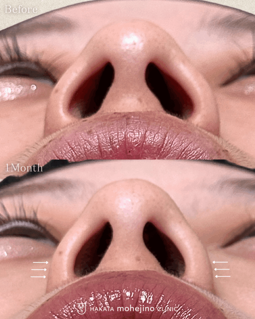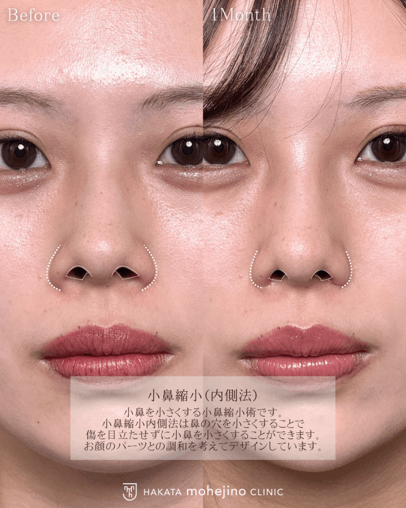 | 施術の説明 | 小鼻を小さくする小鼻縮小術の症例です。 小鼻縮小内側法は鼻の穴を小さくすることで傷を目立たせずに小鼻を小さくすることができます。 お顔のパーツとの調和を考えてデザインしています。 |
