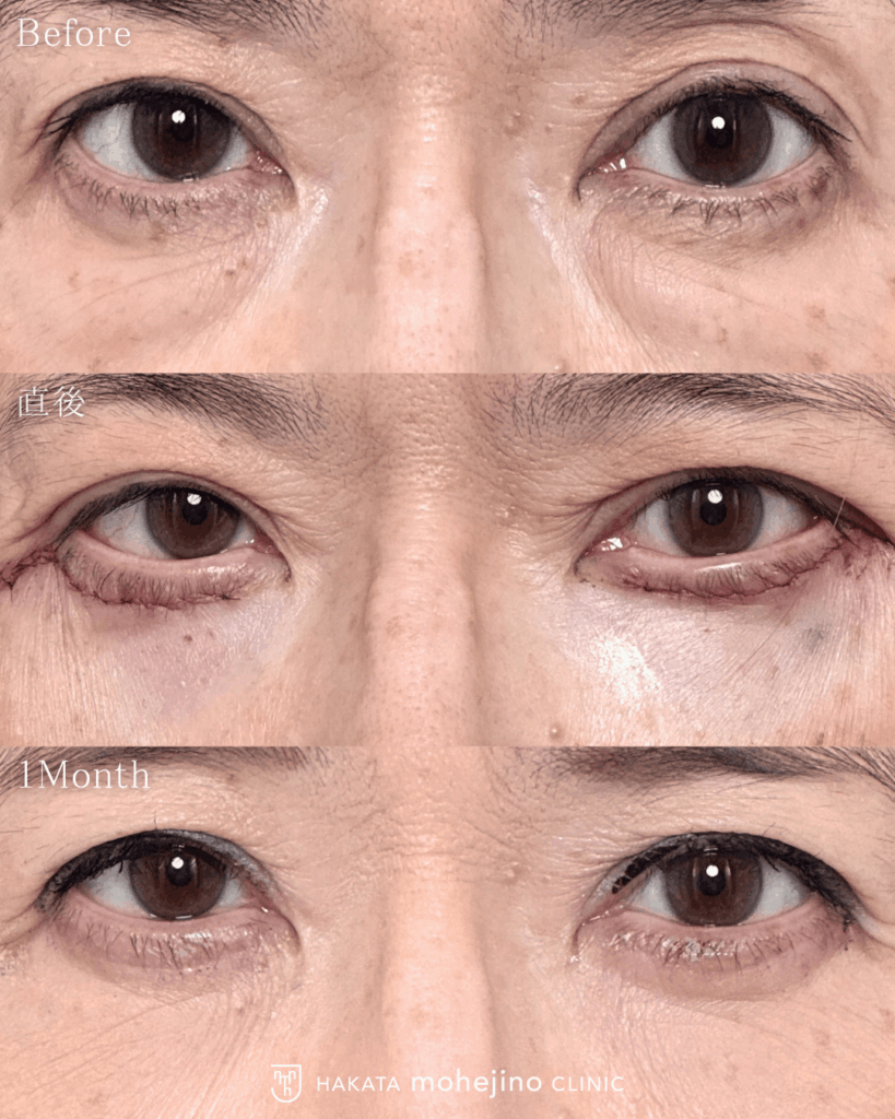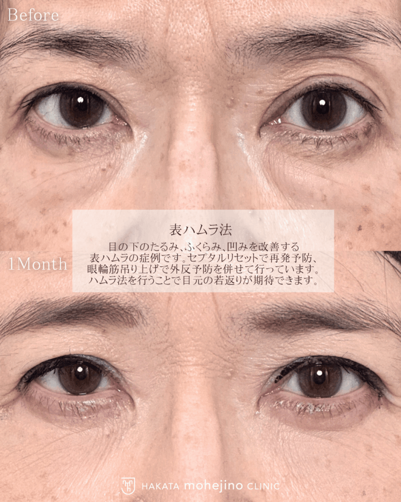 2025.11.19 ハムラ法 表ハムラ法 施術名ハムラ法/表ハムラ法年代・性別60代女性担当医師村田 将光費用432,000円~※メンバー制度税込価格治療期間・回数1回リスク・副作用薬剤アレルギー、腫れ、下眼瞼外反、下斜筋損傷、複視、内出血、充血、出血、感染など施術の説明目の下のたるみ、ふくらみ、凹みを改善する表ハムラの症例です。セプタルリセットで再発予防、眼輪筋吊り上げで外反予防を併せて行っています。ハムラ法を行うことで目元の若返りが期待できます。 この症例で行った施術のページ ハムラ法 back