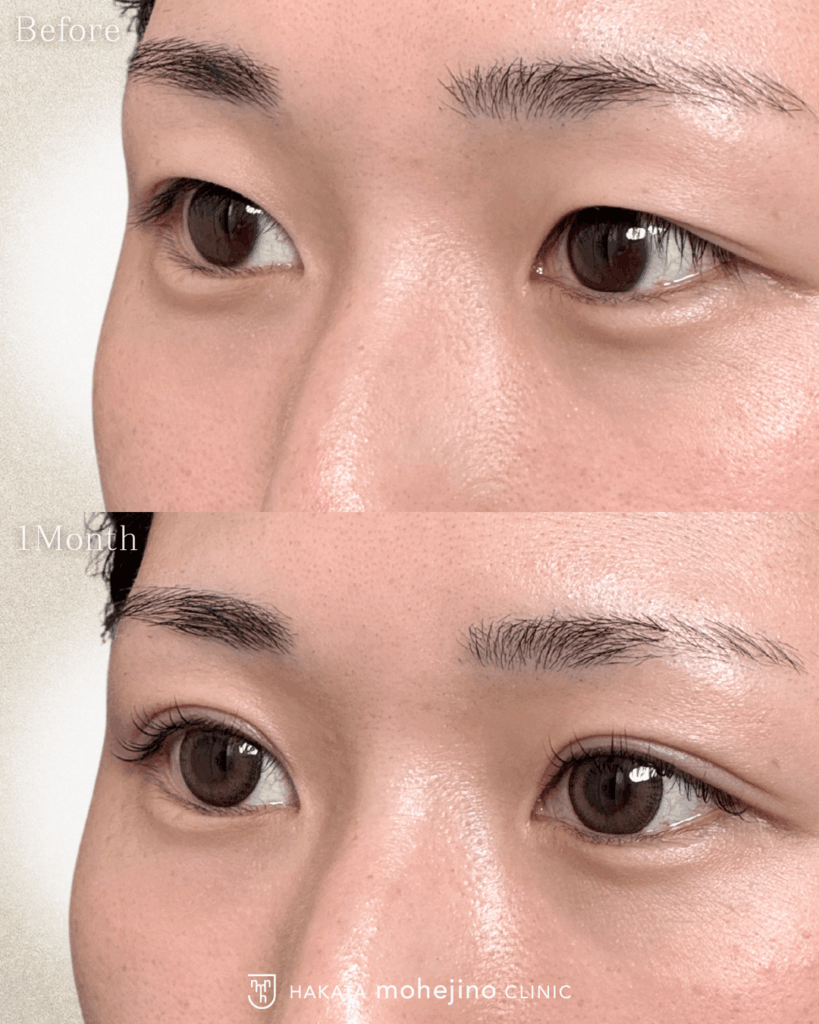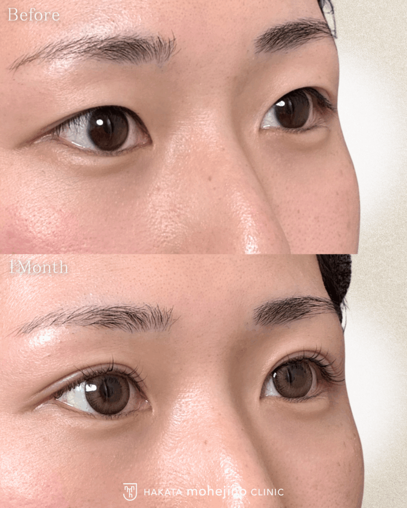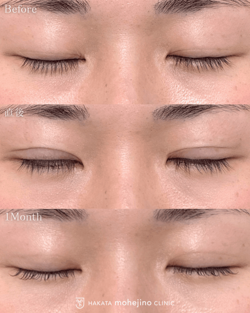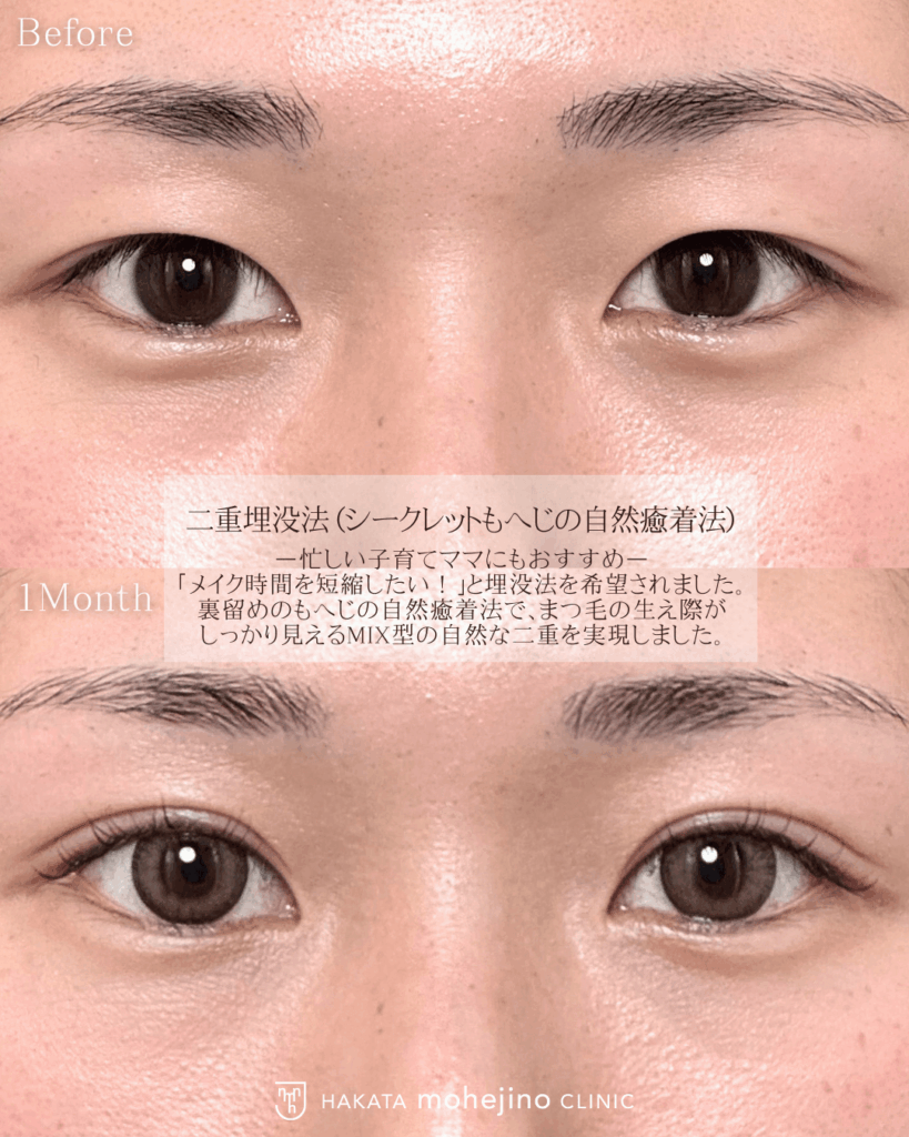 | 施術の説明 | ―忙しい子育てママにもおすすめ― シークレットもへじの自然癒着法の症例です。 「メイク時間を短縮したい!」と埋没法を希望されました。 裏留めのもへじの自然癒着法でまつ毛の生え際がしっかり見えるMIX型の自然な二重を実現しました。 |