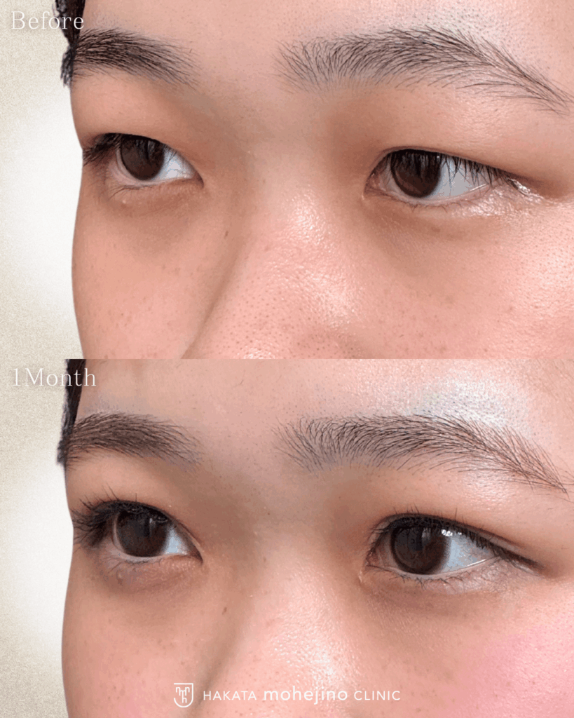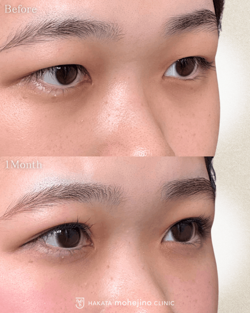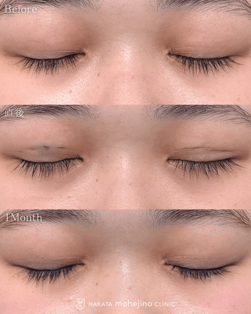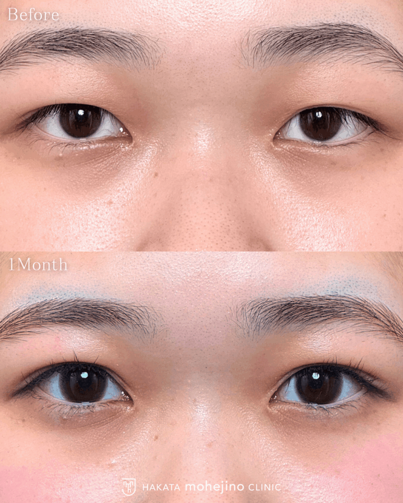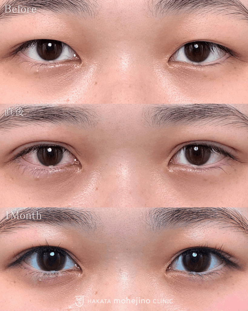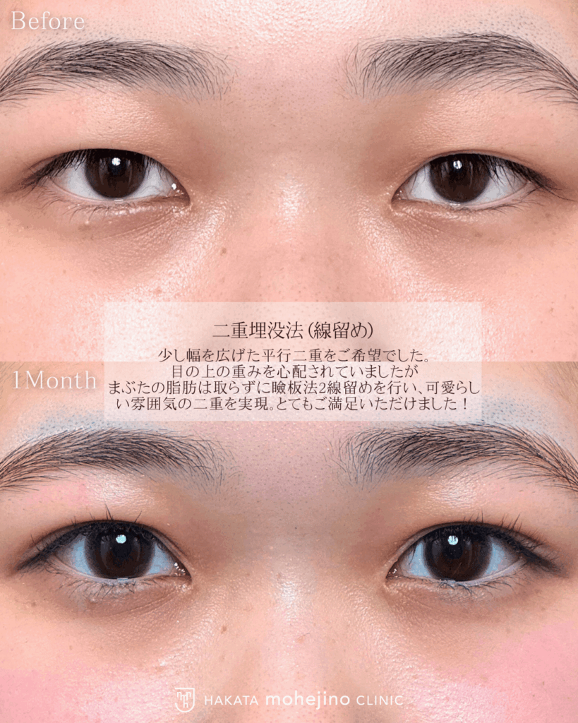 | 施術の説明 | 二重埋没法線留めの症例です。 少し幅を広げた平行二重をご希望でした。 目の上の重みを心配されていましたが、まぶたの脂肪は取らずに瞼板法2線留めを行い、可愛らしい雰囲気の二重を実現。 とてもご満足いただけました! |