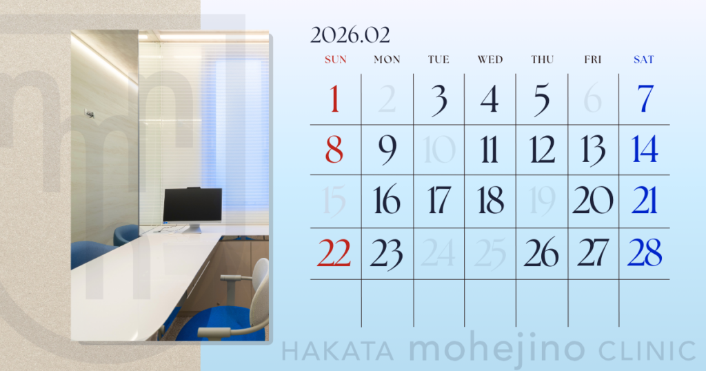 2025.12.15 診療日 2月休診日のお知らせ いつも博多もへじのクリニックをご利用いただき、誠にありがとうございます。 2026年02月の休診日は下記の通りでございます。02月02日(月)02月06日(金)02月10日(火)02月15日(日)02月19日(木)02月24日(火)02月25日(水)ご来院の際はお間違いのないようご確認をお願いいたします。皆様のご来院を 医師・スタッフ一同心よりお待ちしております! backnext